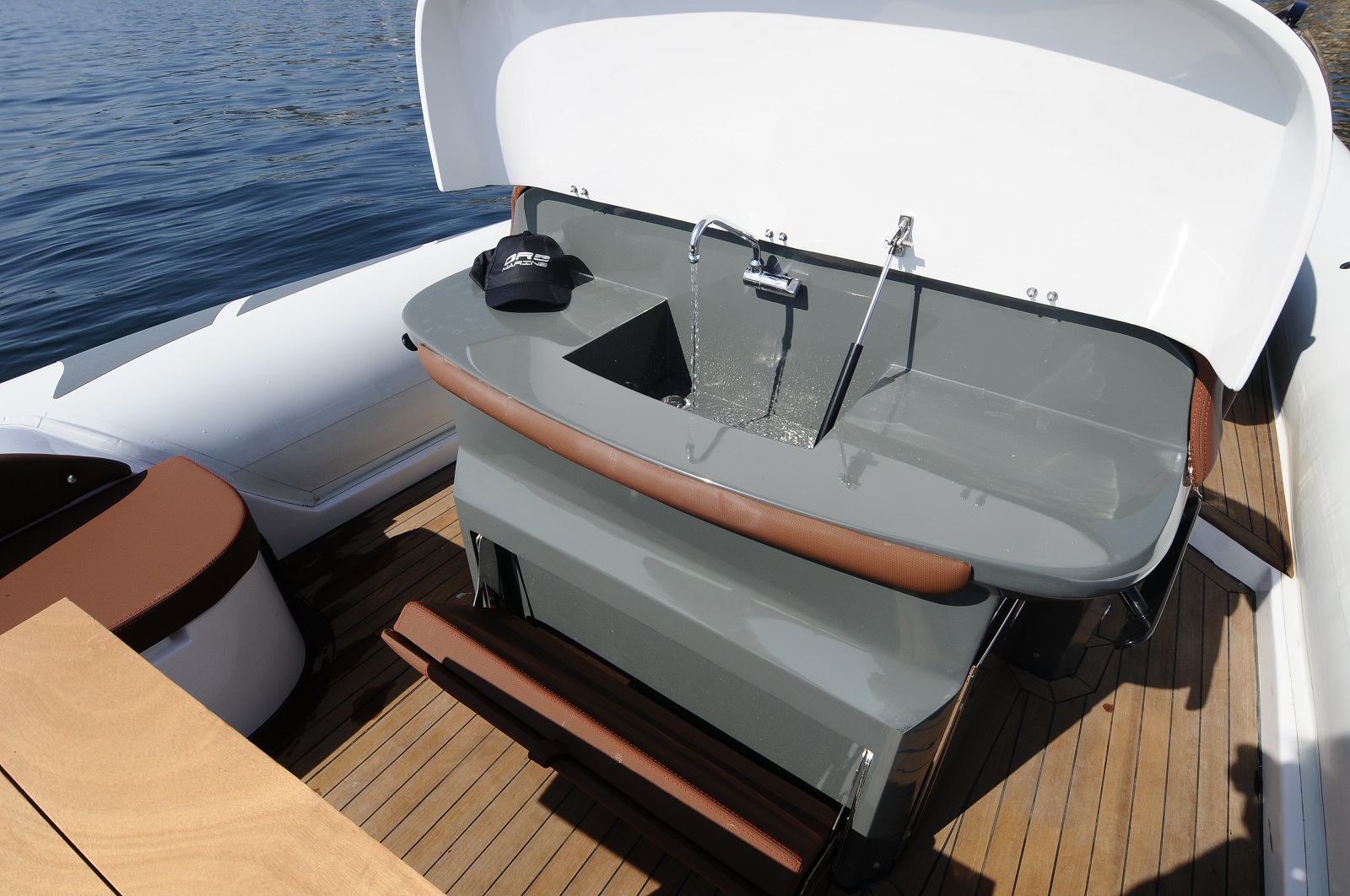 La console est spacieuse et ergonomique pour gérer l’ensemble du bateau, le moteur peut être soit hors-bord (2 x 400 chevaux) sterndrive pour un total de 800 chevaux qui peut être installé, même si moins de « cavalerie » suffit pour obtenir des performances capables de pleinement satisfaire les amateurs de volicité.